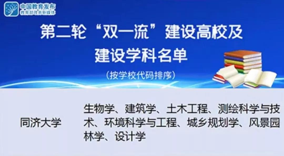 根據(jù)國務(wù)院《統(tǒng)籌推進世界一流大學(xué)和一流學(xué)科建設(shè)總體方案》,以及教育部、財政部、國家發(fā)展改革委《關(guān)于深入推進世界一流大學(xué)和一流學(xué)科建設(shè)的若干意見》和《統(tǒng)籌推進世界一流大學(xué)和一流學(xué)科建設(shè)實施辦法(暫行)》,經(jīng)專家委員會認定,教育部等三部委研究并報國務(wù)院批準,第二輪“雙一流”建設(shè)高校及建設(shè)學(xué)科名單2月14日正式公布。同濟大學(xué)入選第二輪“雙一流”建設(shè)高校,同濟大學(xué)的生物學(xué)、建筑學(xué)、土木工程、測繪科學(xué)與技術(shù)、環(huán)境科學(xué)與工程、城鄉(xiāng)規(guī)劃學(xué)、風(fēng)景園林學(xué)、設(shè)計學(xué)8個學(xué)科入選第二輪“雙一流”建設(shè)學(xué)科,其中,生物學(xué)為第二輪“雙一流”建設(shè)新增學(xué)科。