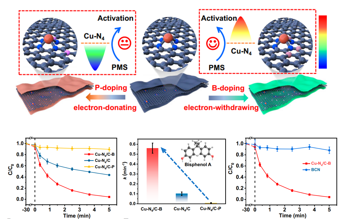 該研究通過在碳基底中引入缺電子的B元素或富電子的P元素,系統(tǒng)調(diào)節(jié)了Cu中心的電子密度,并研究了其對活化PMS降解雙酚A的反應(yīng)動力學(xué)的影響。其中,缺電子Cu-N4/C-B材料具有最佳的催化氧化能力,優(yōu)于絕大部分非均相類芬頓催化劑。而富電子的Cu-N4/C-P催化劑則導(dǎo)致PMS活化能力的下降。實驗結(jié)果及理論計算表明,B原子的長程作用可以降低Cu活性位點的電子密度,使d帶中心下移,優(yōu)化PMS的吸附活化能。在原子水平上精細(xì)的調(diào)控Cu位點電子結(jié)構(gòu)的,優(yōu)化活化PMS反應(yīng)動力學(xué),為先進類芬頓催化劑材料的設(shè)計提供理論指導(dǎo)和技術(shù)支撐。