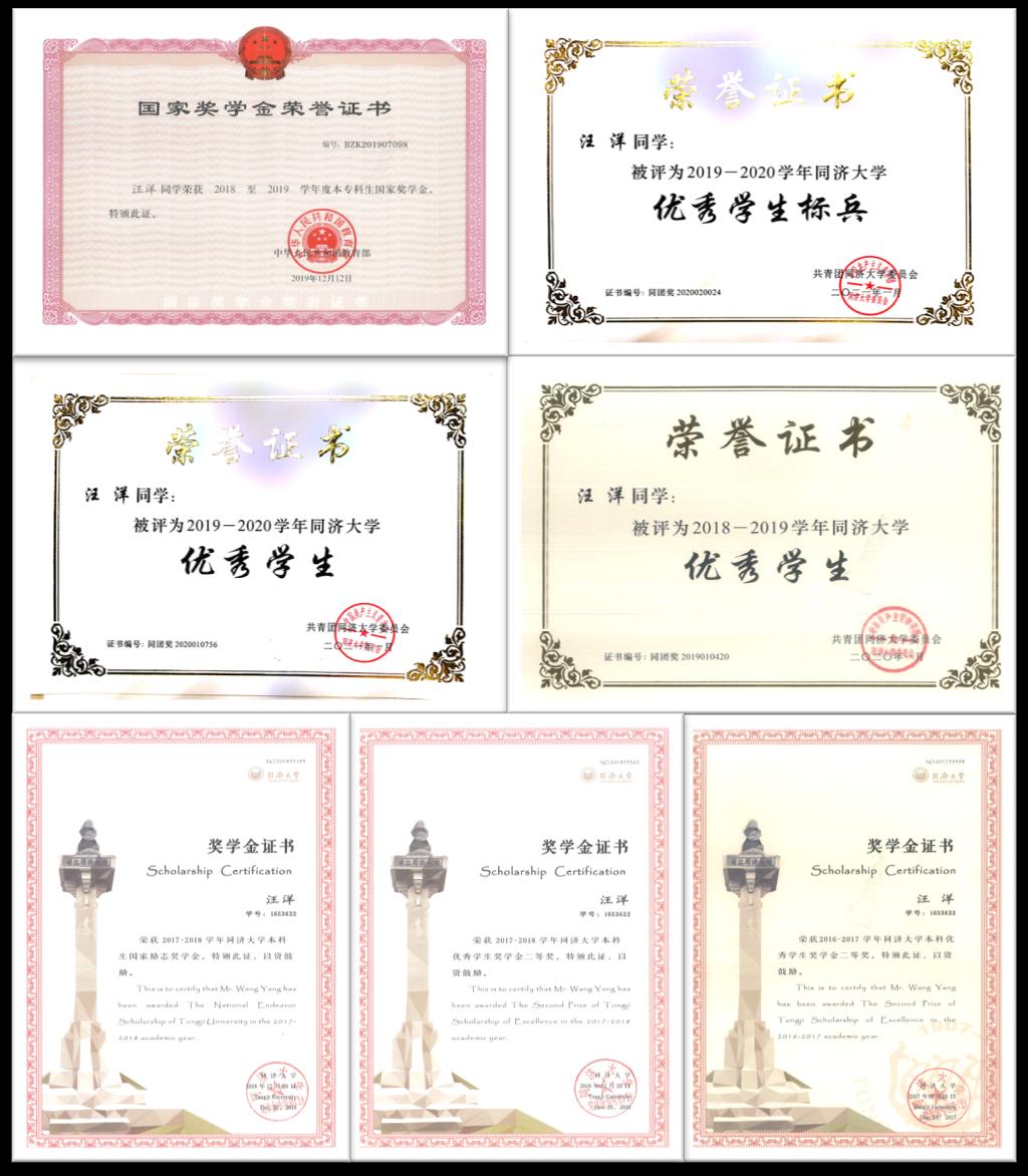 汪洋為中共黨員,他成績優(yōu)異,刻苦鉆研,綜合排名年級第一,連續(xù)兩年獲得國家獎學金,并先后獲得同濟大學本科生學術(shù)之星、優(yōu)秀學生標兵等榮譽稱號,參加“挑戰(zhàn)杯”“互聯(lián)網(wǎng)+”等創(chuàng)新創(chuàng)業(yè)比賽獲國家級獎項3項、省部級獎項4項,發(fā)表相關文章3篇,申請專利6項。