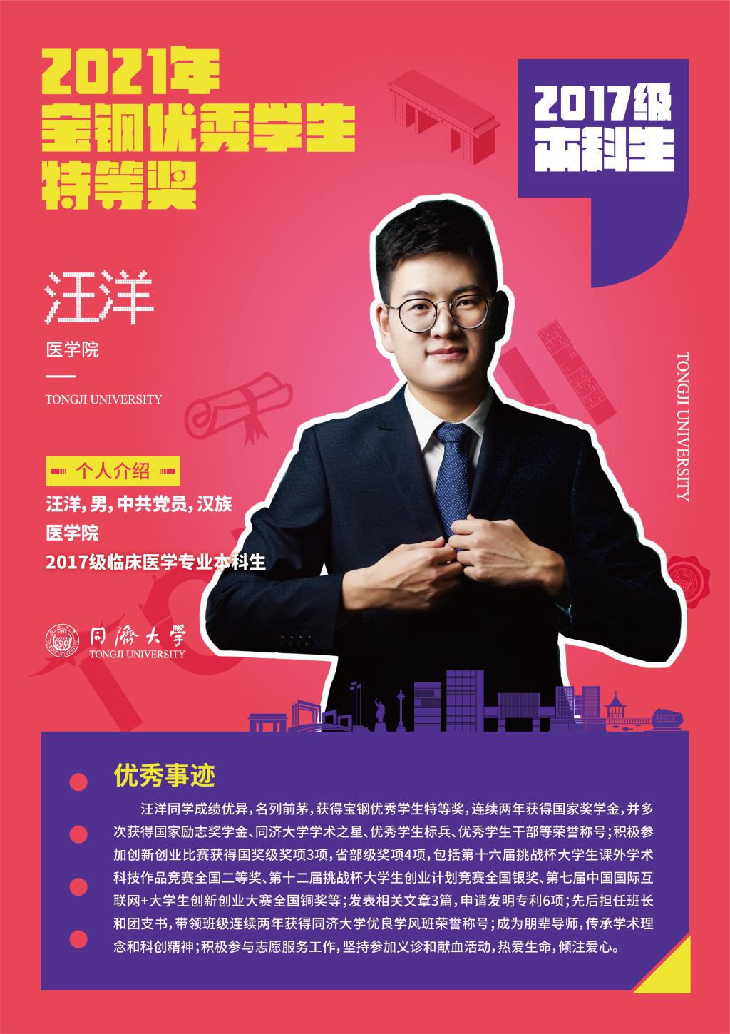 發(fā)布時間:2021年12月14日 11:21 訪問數(shù):近日,2021年度寶鋼教育獎揭曉,同濟大學醫(yī)學院臨床醫(yī)學專業(yè)2017級本科生汪洋榮獲“寶鋼優(yōu)秀學生特等獎”。
