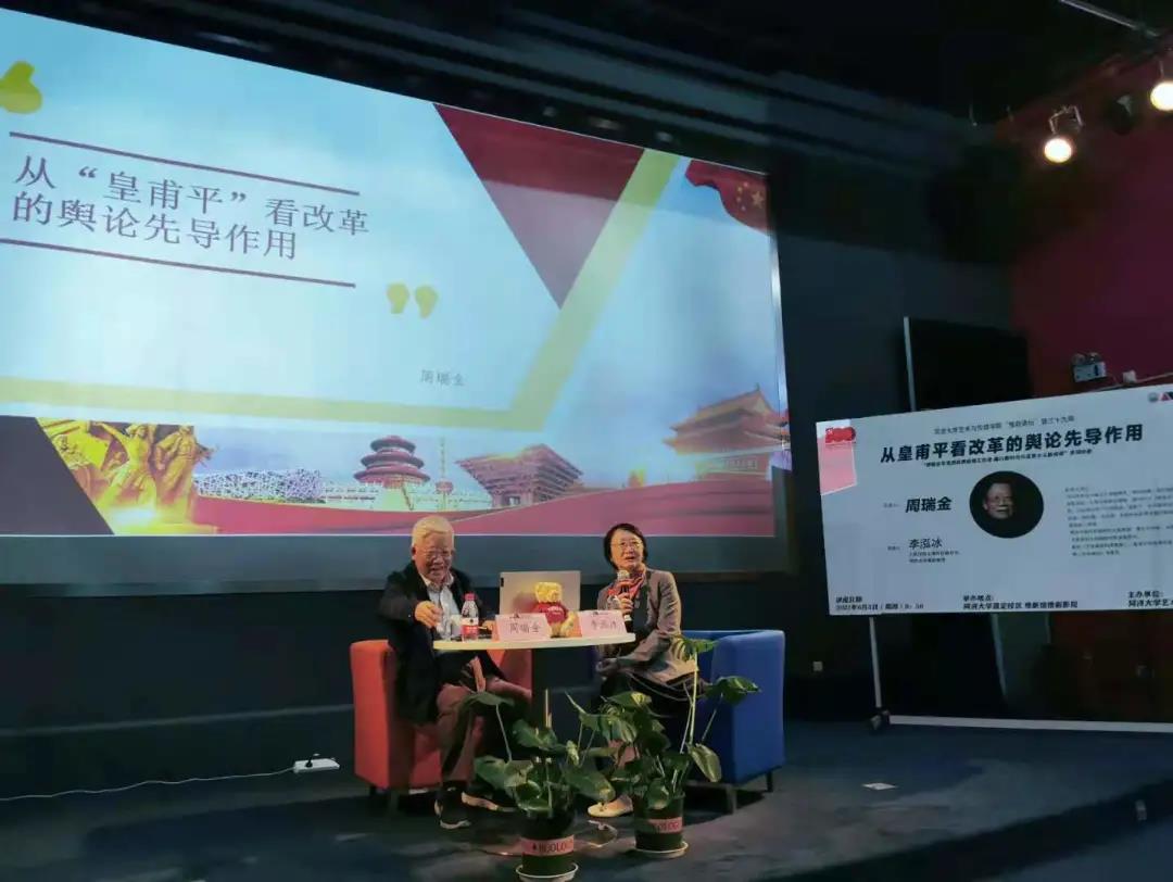 6月3日,“致敬百年黨的優秀新聞工作者,踐行新時代馬克思主義新聞觀”系列講座之“從‘皇甫平’看改革的輿論先導作用”在藝術與傳媒學院舉行。解放日報原黨委書記,人民日報原副總編輯,中國社科院研究生院教授、博士生導師周瑞金,和人民日報社上海分社副社長、我校兼職教授李泓冰,以對話的形式,向師生們講述了黨報人對新聞理想和家國情懷的獨到見解。