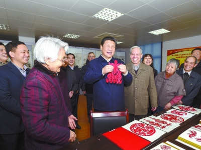 農歷羊年春節來臨之際,2月13日至16日,中共中央總書記、國家主席、中央軍委主席習近平來到陜西,看望慰問廣大干部群眾,向全國各族人民致以新春祝福,祝偉大祖國繁榮昌盛、各族人民幸福安康。這是15日上午,習近平在西安市雁塔區電子城街道二〇五所社區服務中心,拿起一幅“三陽開泰”剪紙,祝愿全國各族人民新春愉快、羊年大吉,生活喜氣洋洋,事業蒸蒸日上。(新華社記者 李學仁攝)
